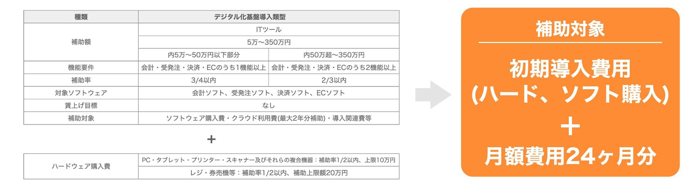 中小企業・商機の事業者を対象に、インボイス制度の対応を見据えて、企業間のデジタル化を一挙に推進するため、会計・決済・EC等のITツールに加えて、パソコン・タブレット端末・レジ・券売機等のハードウェア導入費用を優先的に支援する制度です。